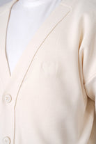White cardigan made from 100% acrylic, featuring a classic fit, button closure, and a solid design with a small heart detail on the left chest; it fits true to size and is machine washable at 30°C.