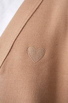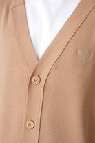 Beige cardigan made from 100% acrylic, featuring a classic fit, button closure, and a solid design with a small heart detail on the left chest; it fits true to size and is machine washable at 30°C.